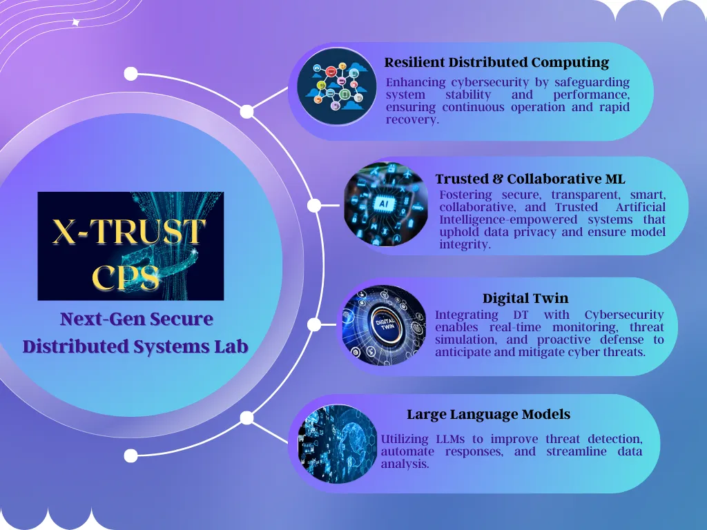 The goal for the X-Trust CPS Lab is to advance the field of cyber-physical systems (CPS) by conducting pioneering research and developing next-generation, trustworthy distributed systems. We focus on integrating artificial intelligence and machine learning (ML) technologies to enhance the reliability, security, and efficiency of CPS. By leveraging AI/ML innovations, we aim to create adaptive and intelligent systems capable of anticipating, responding to, and mitigating complex challenges.