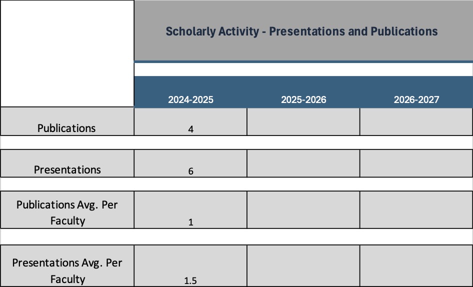 Benchmark: Annually, faculty will participate in at least one professional development opportunity and one external service opportunity and submit at least one conference presentation or journal article proposal.