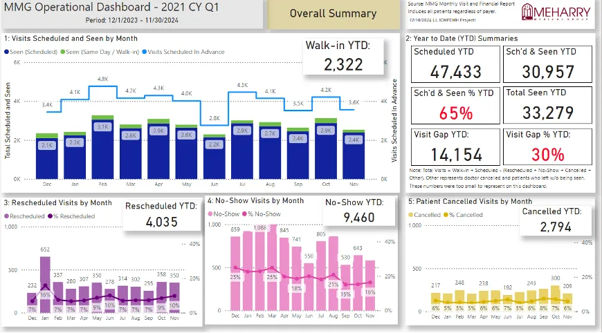 Clinical and patient analytical support for MMG also includes an operations dashboard. The data visualizations include patient visits, rescheduled visits, no-shows, healthcare gaps, and future appointments to inform decisions for each clinic.