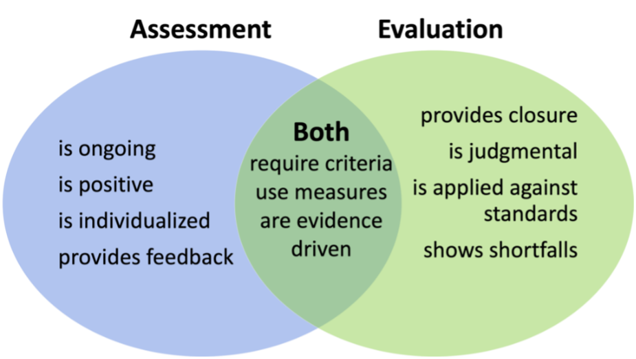Although the terms assessment and evaluation are often used synonymously, they are distinctive and different. The intent of assessment is to measure effectiveness; evaluation adds a value component to the process.