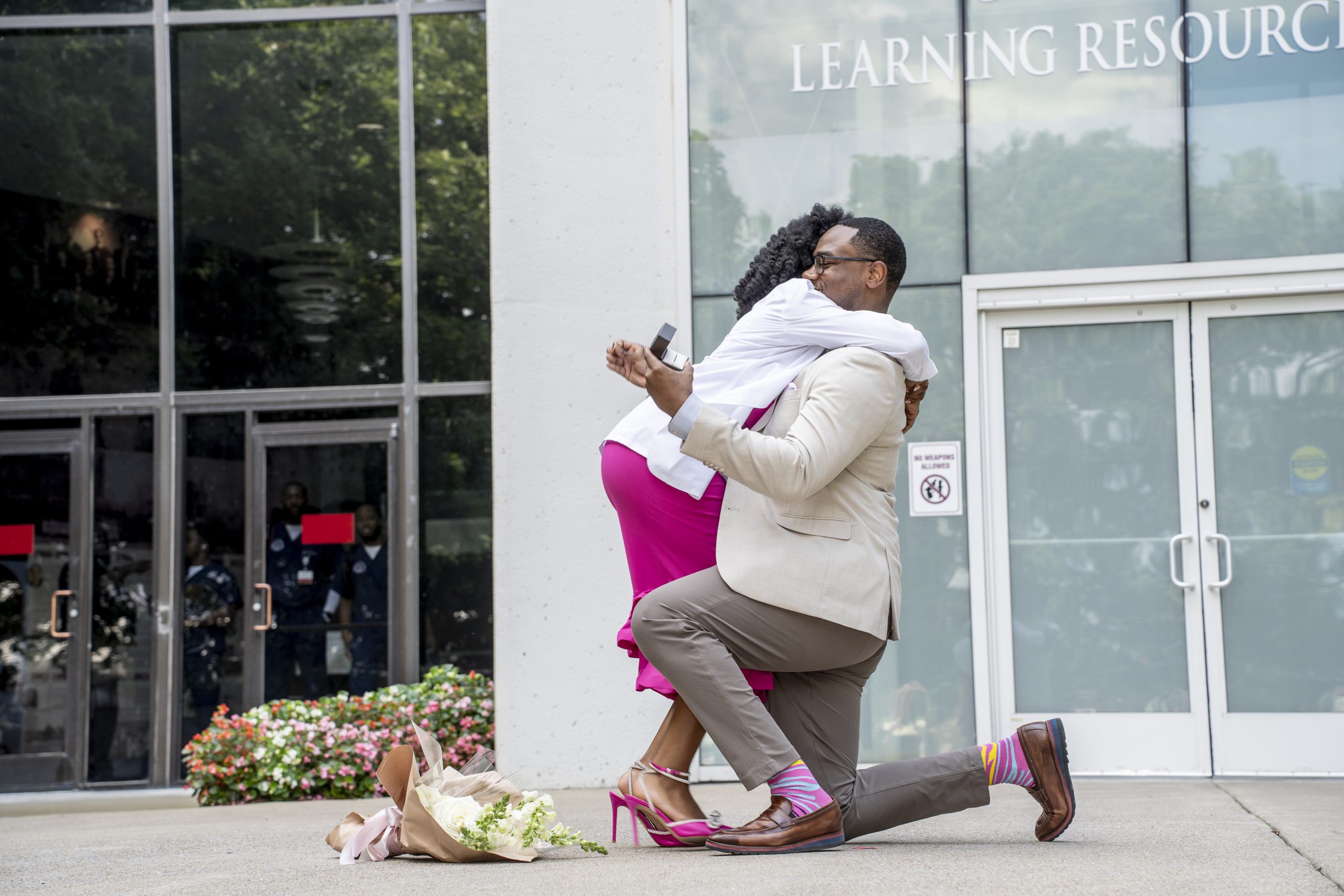 But the celebration didn’t end there. Following the ceremony, Ball, originally from Largo, Maryland, surprised John with a heartfelt proposal in front of their families and friends outside on the steps of The Stanley S. Kresge Learning Resource Center.